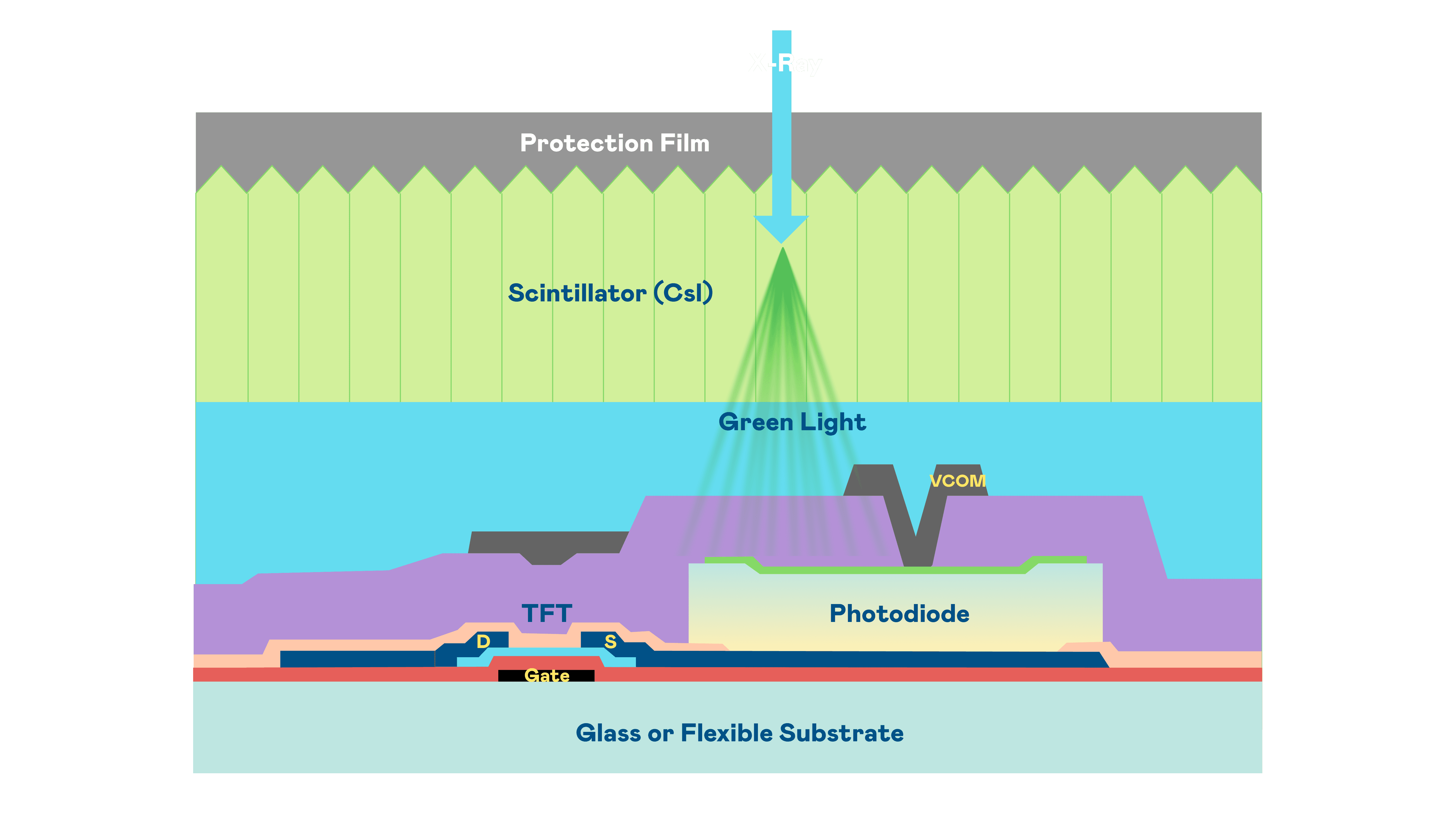 蓝狮在线的X光影像感测阵列使用薄膜电晶体 (TFT) 作为每个像素的读取开关,,搭配光电二极体(Photodiode)的光电转换元件,,用以感测X光影像讯号。。